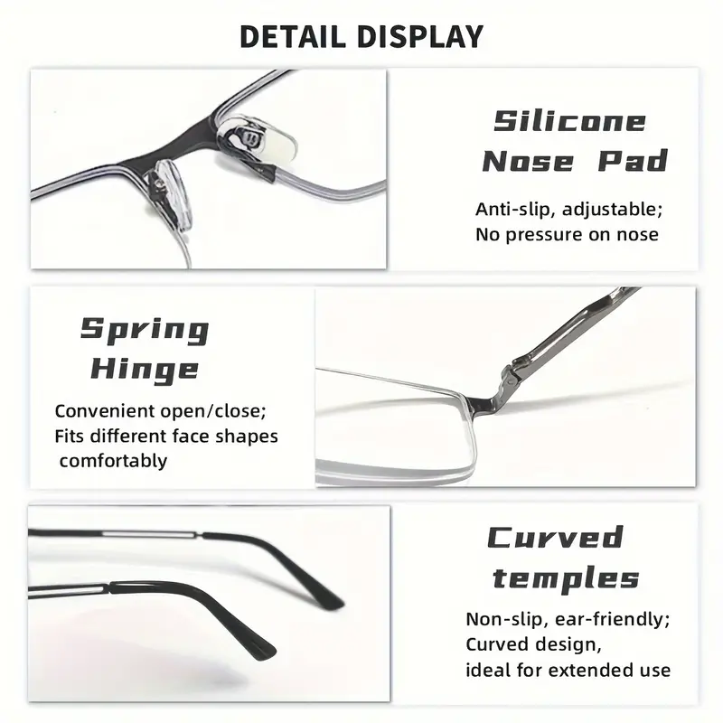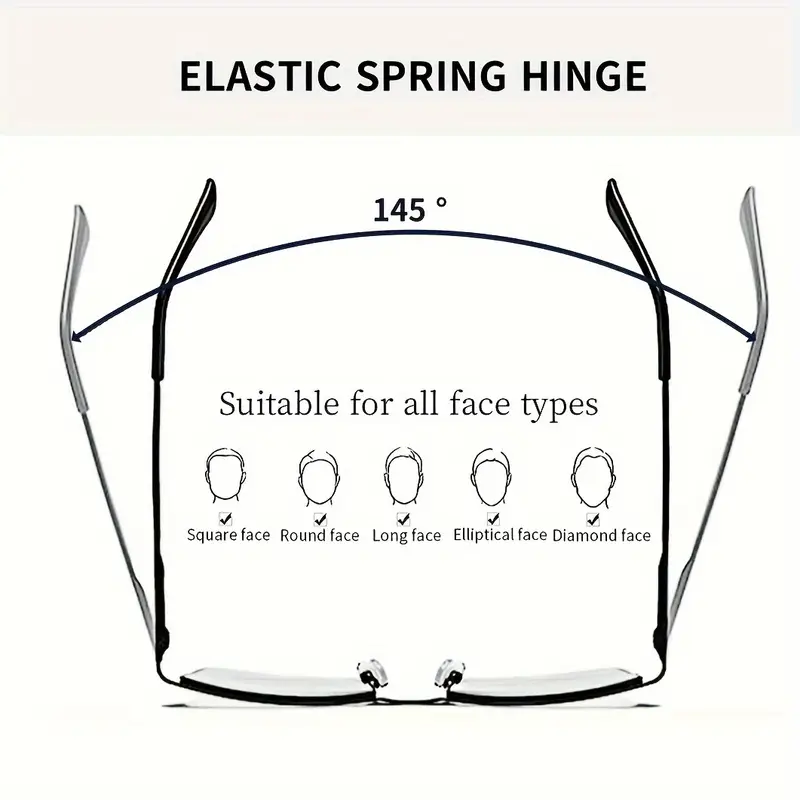 Her bir gözlük, yüksek çözünürlüklü HD lens teknolojisiyle donatılmıştır. Bu sayede küçük yazılar bile daha net okunabilir, kitap okurken, telefonda yazı incelerken ya da bilgisayarda çalışırken gözlerinizi yormaz. 2 numaralı cam derecesiyle gözlerinize tam destek sunar. Yaylı menteşeler ise çerçevenin yüzünüze uyum sağlamasını kolaylaştırır; çerçevede esneme payı sunarak kırılmaları önler.