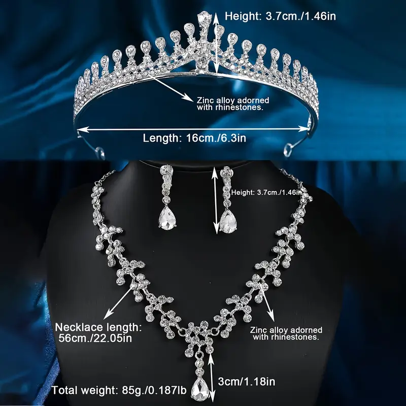 Gelin tacı, gelinliğin ve genel gelin görünümünün en dikkat çekici aksesuarlarından biridir. Bu özel set, hem şıklığı hem de işlevselliği bir arada sunar. Zinc alaşımdan üretilmiş olup taşlarla zarif bir şekilde bezenmiştir. Set; 3.7 cm yüksekliğinde Helenistik tarzda bir taç, 56 cm uzunluğunda göz alıcı bir kolye ve zarif küpelerden oluşur.