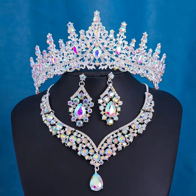 Zinc alaşım üzerine taşlarla süslenmiş bu gelin tacı seti, zarif kolyesi ve uyumlu küpeleriyle özel gününüzde ihtişam katacak. Gelinlik tacı arayanlar için ideal bir seçim.