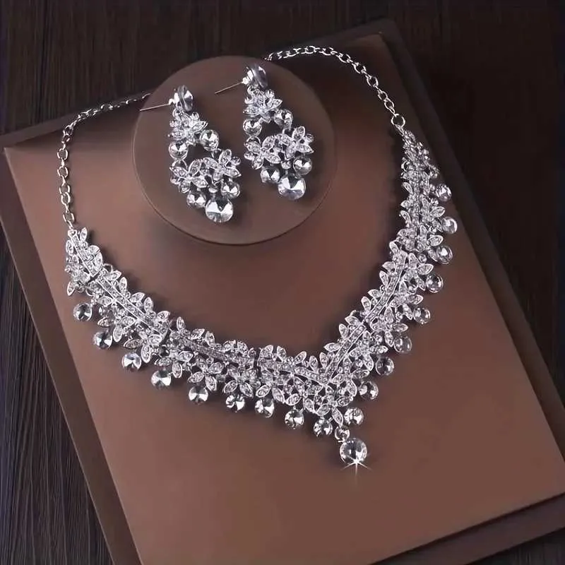 Zarif Taşlı Gelin Tacı Seti: Kolye, Küpe ve Taç – Düğün & Özel Günler İçin Işıltılı Aksesuar